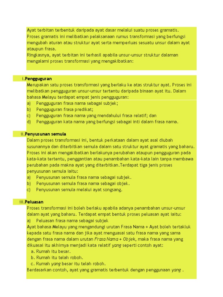 Proses pengguguran Satu proses transformasi yang berlaku ke atas struktur ayat mengakibatkan pengguguran unsur-unsur tertentu daripada binaan ayat itu dan dengan itu pada peringkat permukaan unsur yang digugurkan itu tidak wujud lagi. Dia sangat pandai dia selalu belajar dia sangat pandai kerana selalu. Lihat contoh transformasi terjemahan dalam ayat dengar sebutan dan pelajari tatabahasa.
